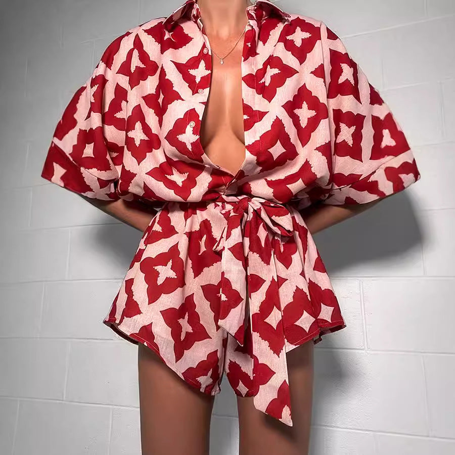 European And American Loose Casual Print Lace-up Jumpsuit Shorts